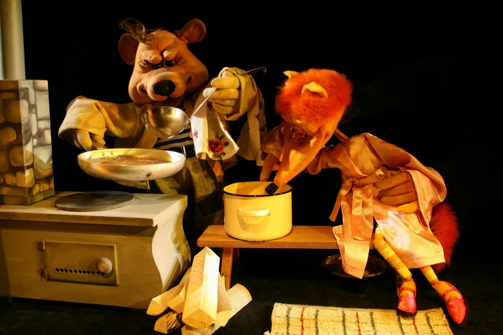 Главные герои – добродушный мишка и хитрая лиса. Пока Медведь печет блины и вялит рыбку, Лиса Патрикеевна таскает запасы соседа. Зрители становятся участниками смешных перепалок героев спектакля. Эта сказка одинаково любима детьми и взрослыми.