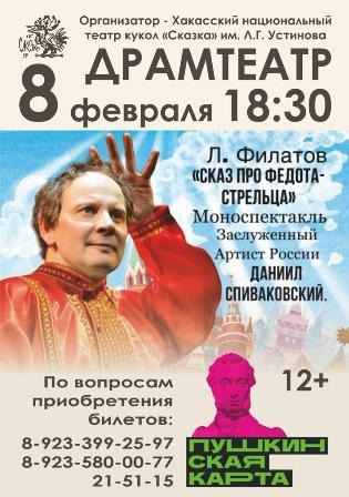 8 февраля 2023 года в 18:30 на большой сцене Русского академического театра драмы имени М.Ю. Лермонтова ( ул. Щетинкина, 12) пройдёт моноспектакль заслуженного артиста России Даниила Спиваковского по знаменитому произведению Леонида Филатова «Про Федота-стрельца, удалого молодца» - которое стало настоящей народной сказкой, разошлось крылатыми фразами, афоризмами.