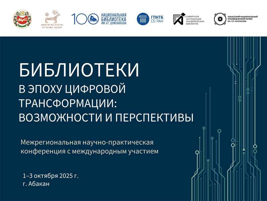 С 1 по 3 октября 2025 года в столице Хакасии пройдет межрегиональная научно-практическая конференция с международным участием «Библиотеки в эпоху цифровой трансформации: возможности и перспективы». Мероприятие приурочено к 100-летию Национальной библиотеки им. Н.Г. Доможакова.