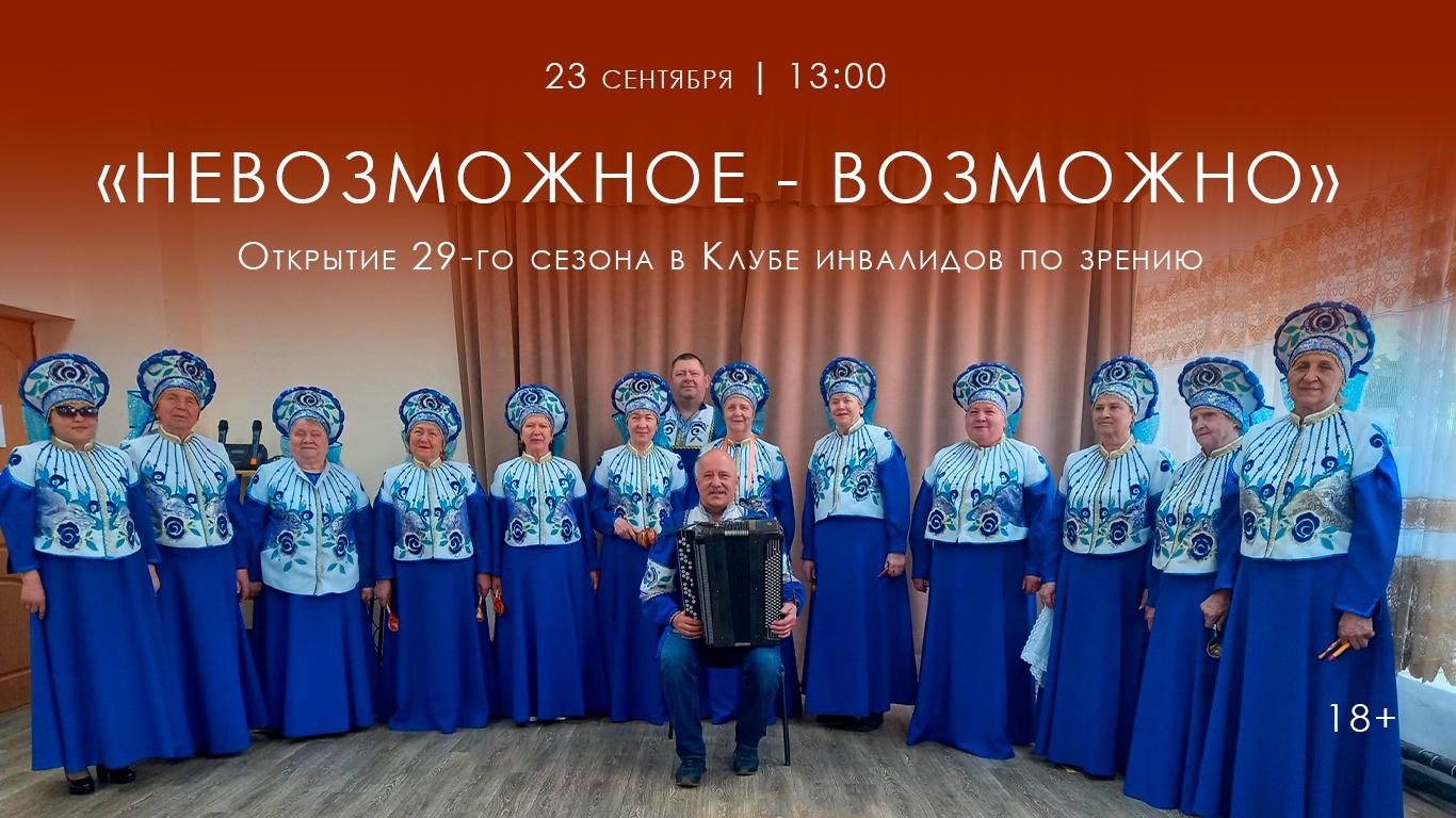 23 сентября в 13:00 в Клубе инвалидов по зрению – филиале Национального центра народного творчества имени С.П. Кадышева состоится открытие 29-го творческого сезона. Концертная программа «Невозможное - возможно» пройдет в рамках инклюзивной творческой лаборатории «Особый взгляд» федерального проекта «Придумано в России».