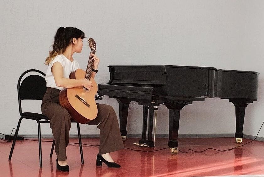 В Хакасском колледже искусств преподаватель Екатерина Валерьевна Шумкова совместно со студентами подготовила концерт – показ игры на гитаре.