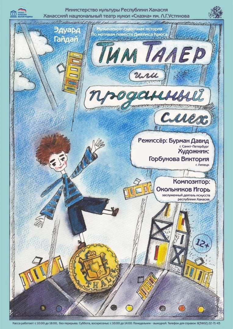 Хакасский национальный театр кукол «Сказка» имени Л.Г. Устинова приглашает детей и взрослых на спектакль «Тим Талер, или проданный смех». Постановка по мотивам одноимённой повести-притчи Джеймса Крюса расскажет вечную историю о том, что истинные ценности нельзя купить или продать.