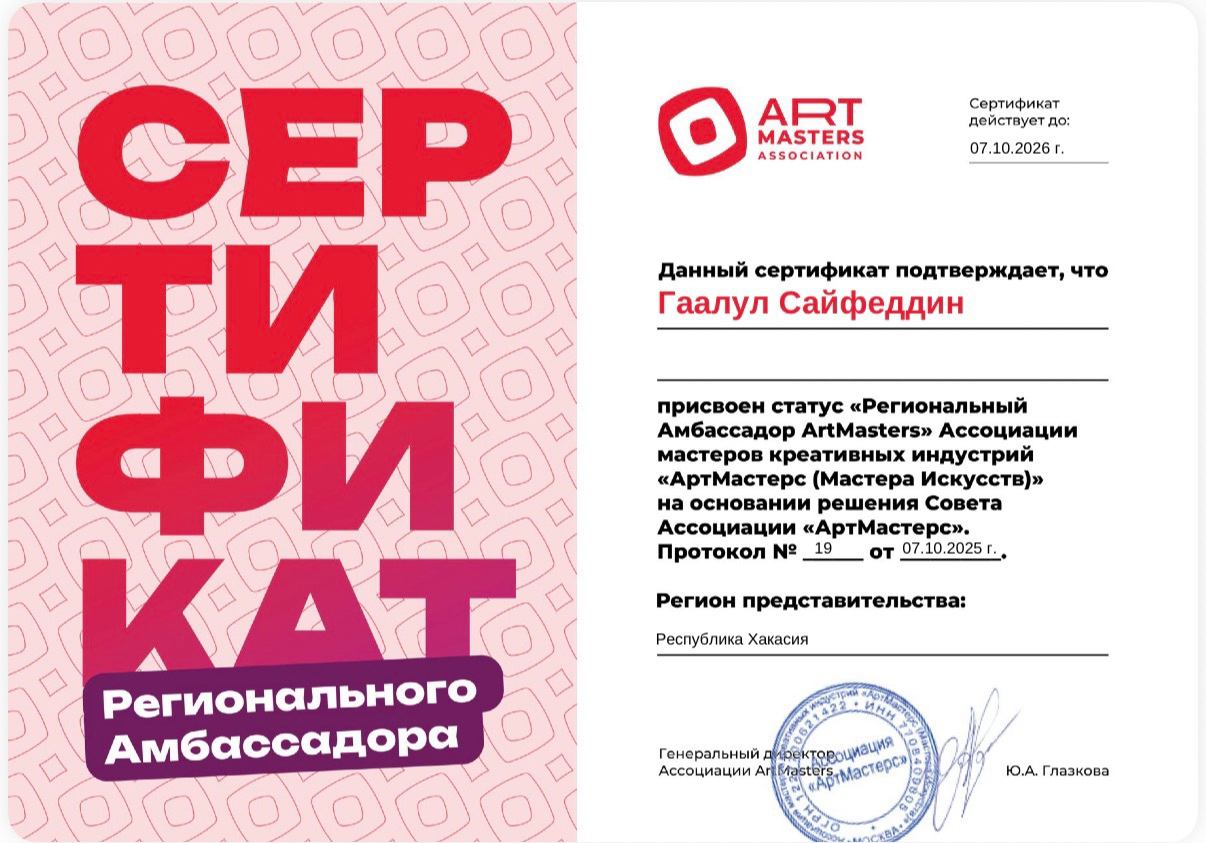 Преподаватель студии «Фото и видеопроизводство» Школы креативных индустрий (ШКИ) Гаалул Сайфеддин получил официальный сертификат, подтверждающий присвоение ему статуса «Региональный амбассадор ArtMasters». Это звание было присвоено Ассоциацией мастеров креативных индустрий за активную работу по продвижению и развитию творческих компетенций в регионе.