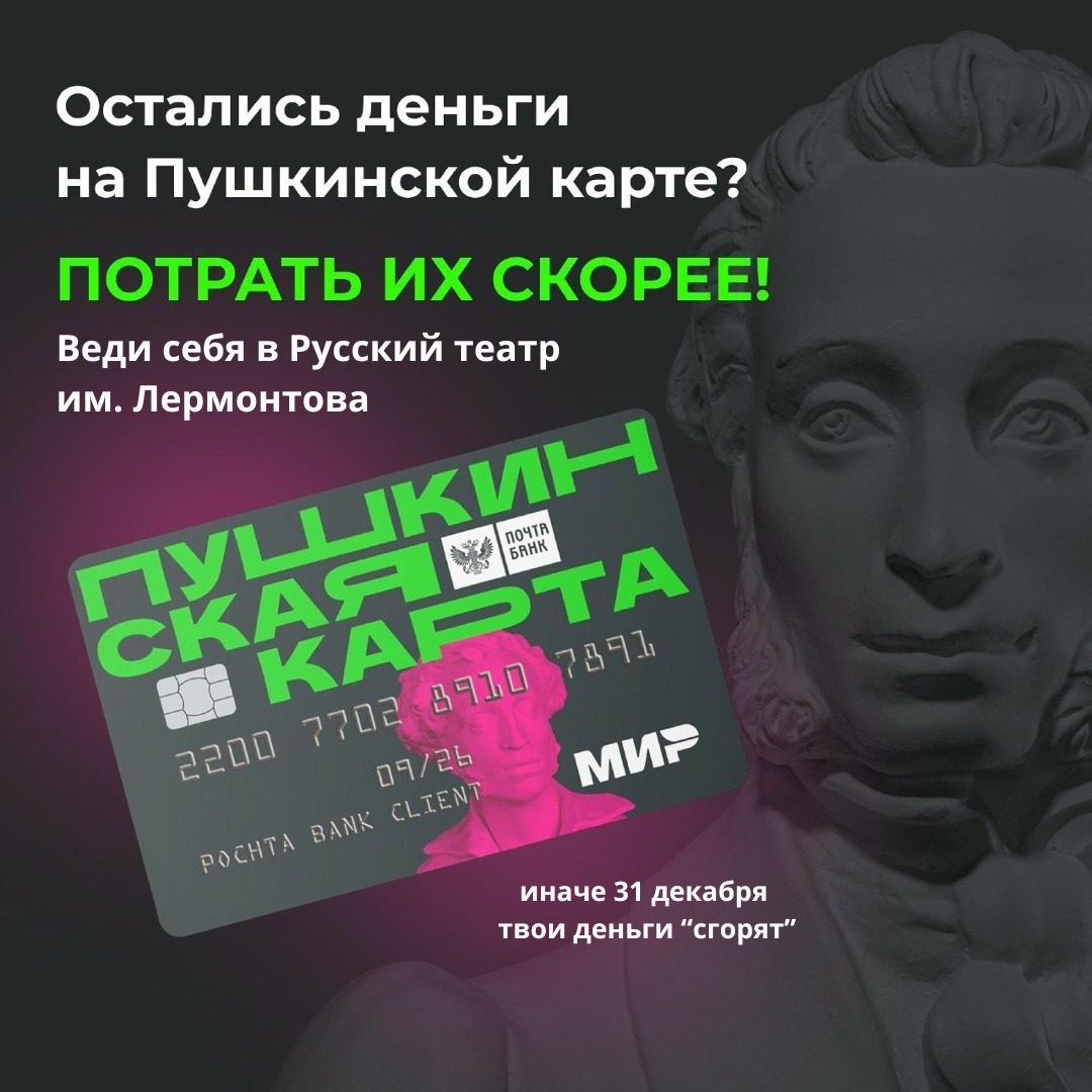 Напоминаем, что баланс «Пушкинской карты» обнулится 31 декабря. У вас осталось меньше двух месяцев, чтобы воспользоваться государственной поддержкой и посетить спектакли Русского академического театра драмы имени М.Ю. Лермонтова.