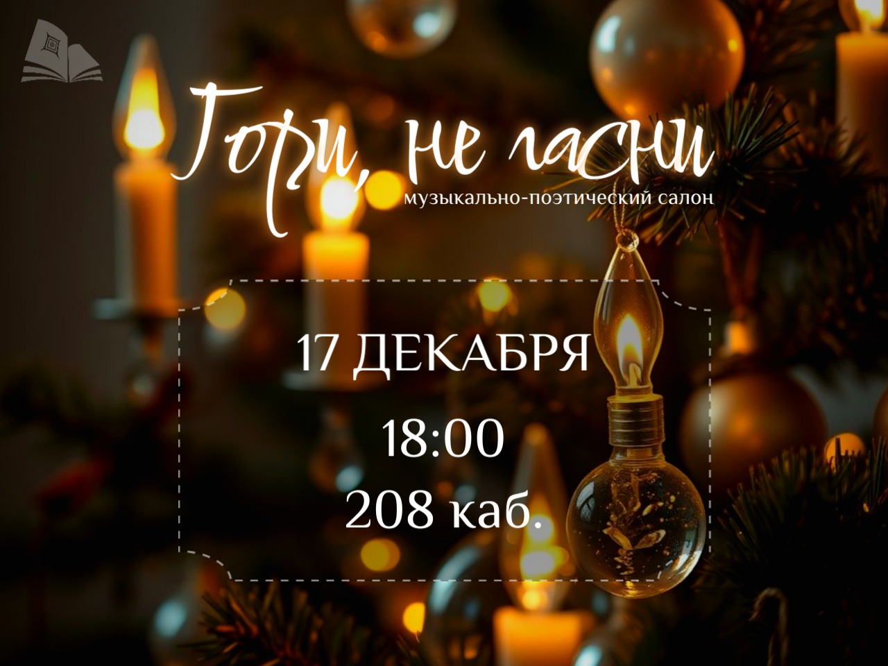 17 декабря в 18:00 Национальная библиотека имени Н. Г. Доможакова приглашает желающих на встречу в музыкально-поэтическом салоне «Гори, не гасни». Гостей ожидает погружение в атмосферу зимнего чуда и предпраздничного настроения, созданное благодаря вечной музыке и трогательным стихам великих авторов, призванным подарить то самое неуловимое рождественское настроение.