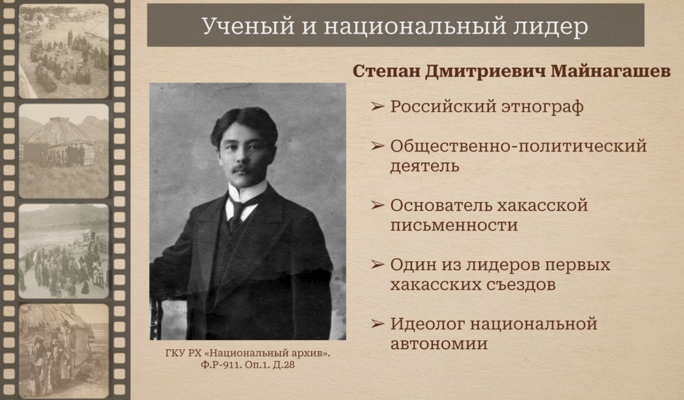 8 января исполнилось 140 лет со дня рождения одного из самых ярких и многогранных деятелей Хакасии — Степана Дмитриевича Майнагашева. Этнограф, основатель хакасской письменности, общественный лидер и идеолог — его наследие стало неотъемлемой частью истории родного края. В честь этого события Национальный архив Республики Хакасия представляет новый видеовыпуск, посвящённый его жизни и деятельности, в рамках проекта «Их имена в документальной истории Хакасии».