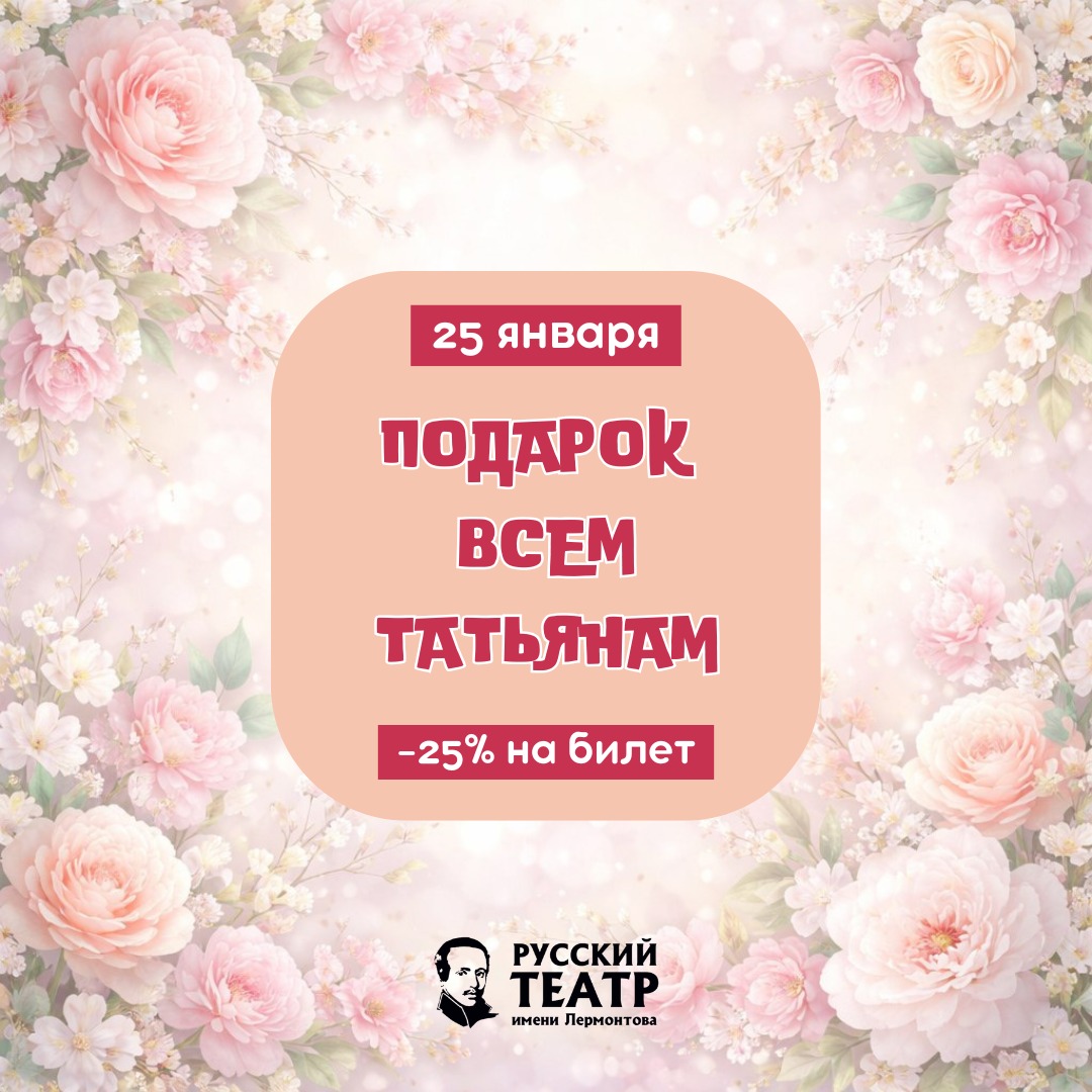 Татьянин день, традиционно отмечаемый 25 января, — не только праздник студентов, но и прекрасный повод поздравить всех женщин, носящих это прекрасное имя. Русский академический театр драмы имени М.Ю. Лермонтова поздравляет всех обладательниц имени Татьяна с их праздником и дарит подарок. 25 января при покупке билетов на спектакли января и февраля действует скидка 25%. Для получения скидки достаточно применить промокод «Таня» при заказе на сайте театра или обращении в кассу.
