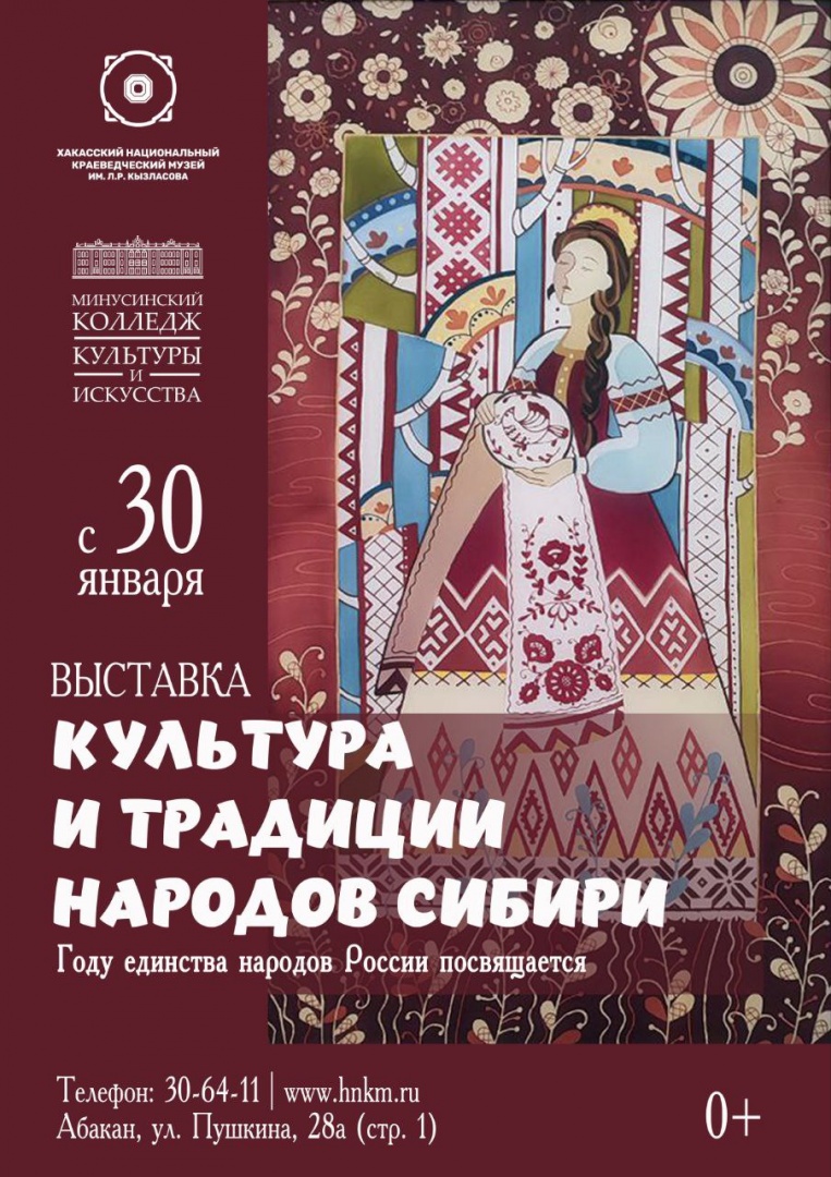 30 января в 15:00 в Хакасском национальном краеведческом музее имени Л. Р. Кызласова состоится открытие выставки дипломных работ студентов Минусинского колледжа культуры и искусства. Экспозиция «Культура и традиции народов Сибири» включает 80 работ, созданных будущими-художниками за последние три года. Мероприятие проводится в рамках Года единства народов России, объявленного Президентом Российской Федерации Владимиром Владимировичем Путиным на 2026 год.