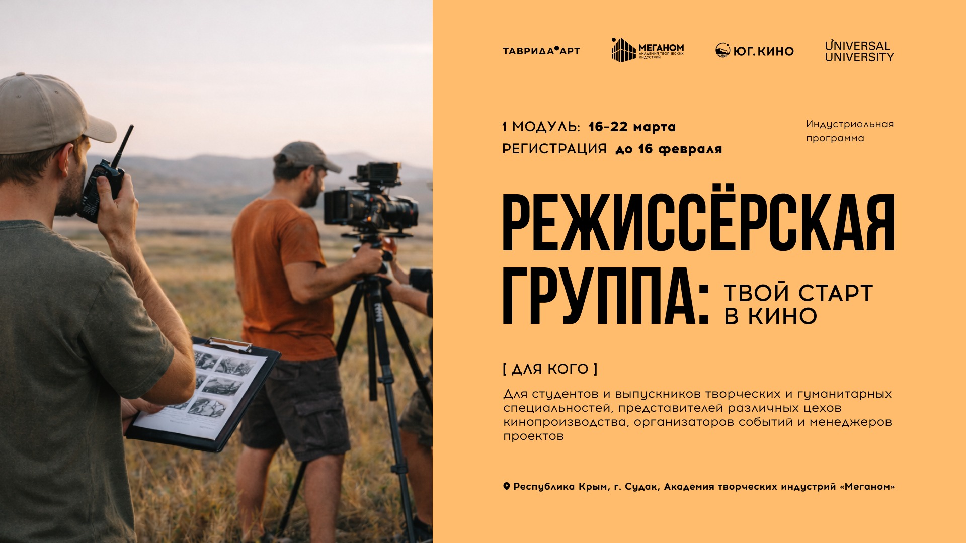 Этой весной в Академии творческих индустрий «Меганом» (проект «Таврида.АРТ») пройдёт программа «Режиссёрская группа: твой старт в кино». Она создана для подготовки специалистов киносъёмочных профессий второго эшелона. Партнёром проекта выступит Университет креативных индустрий Universal University. Кино ближе, чем кажется: подайте заявку на сайте до 16 февраля.