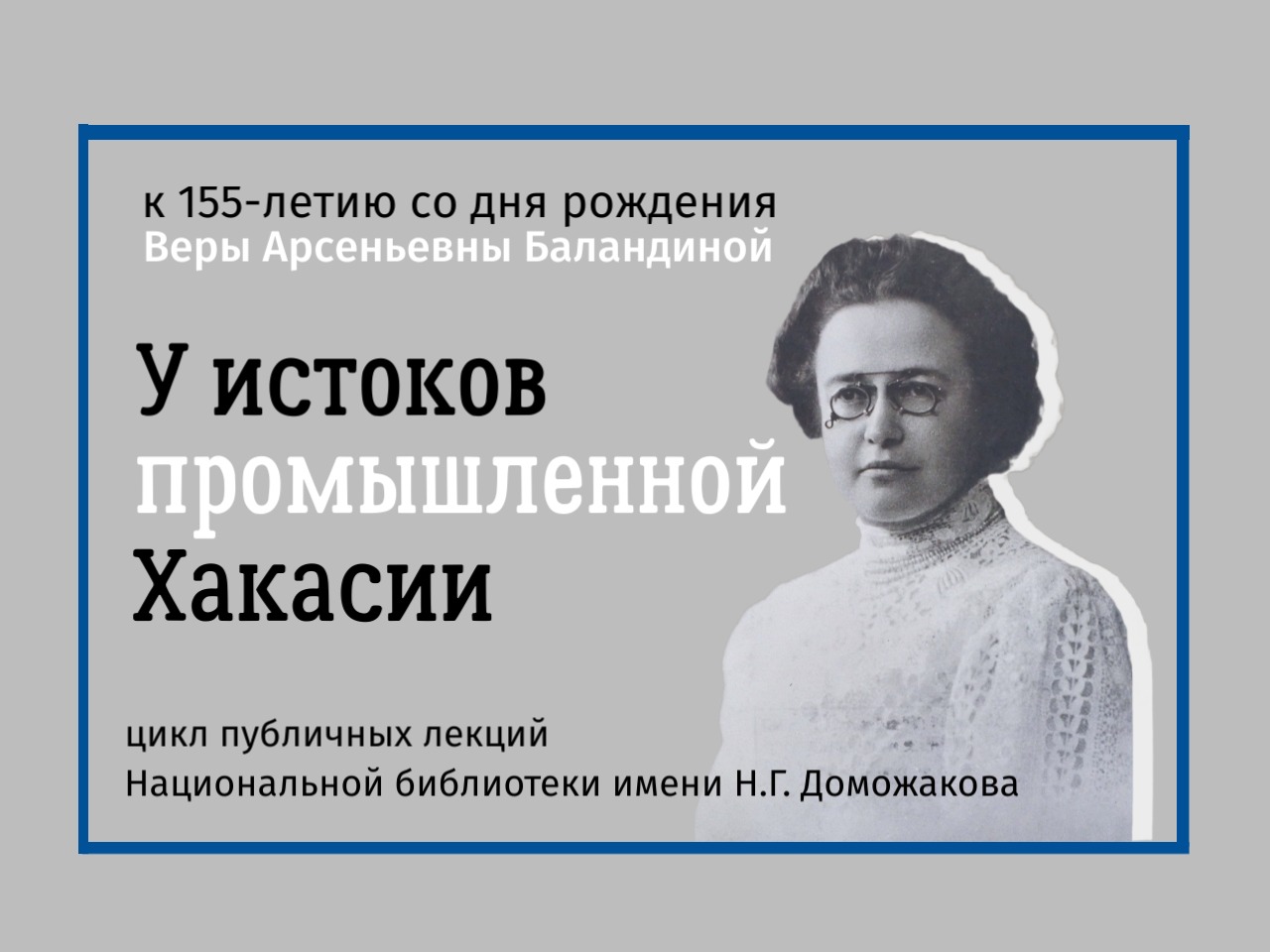 Национальная библиотека им. Н. Г. Доможакова приглашает на публичные лекции, посвящённые 155-летию со дня рождения Веры Арсеньевны Баландиной, в Абакане и Черногорске. Слушатели смогут узнать, как основательница города Черногорска и создательница Ачинск-Минусинской железной дороги повлияла на развитие промышленности Хакасии. Лекцию читает краевед, сотрудник библиотеки Елена Кривоносова.