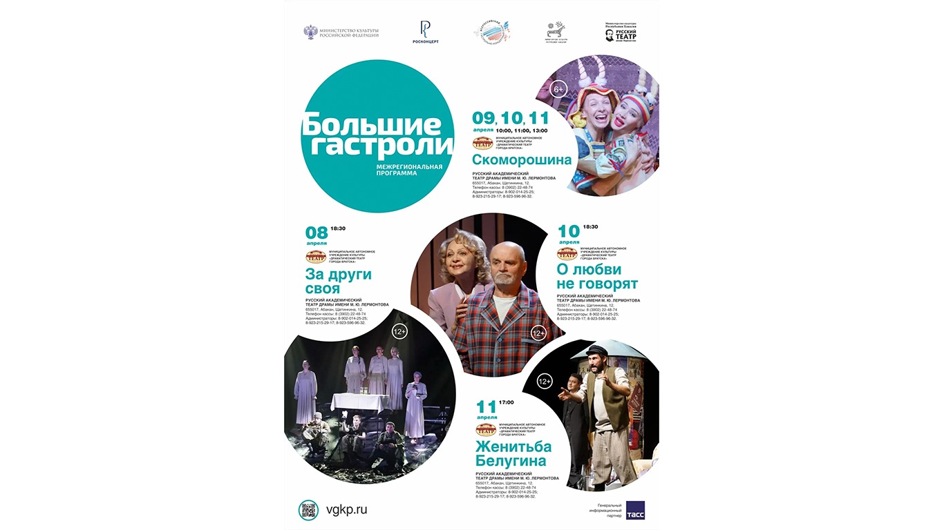 С 8 по 11апреля 2026 года состоятся «Большие гастроли» Братского драматического театра в Абакане, организованные ФГБУК РОСКОНЦЕРТ согласно Всероссийскому гастрольно-концертному плану Министерства культуры Российской Федерации. В рамках межрегионального направления программы «Большие гастроли» на сцене Русского академического театра драмы имени Лермонтова пройдут показы спектаклей «За други своя», «Скоморошина», «О любви не говорят», «Женитьба Белугина».