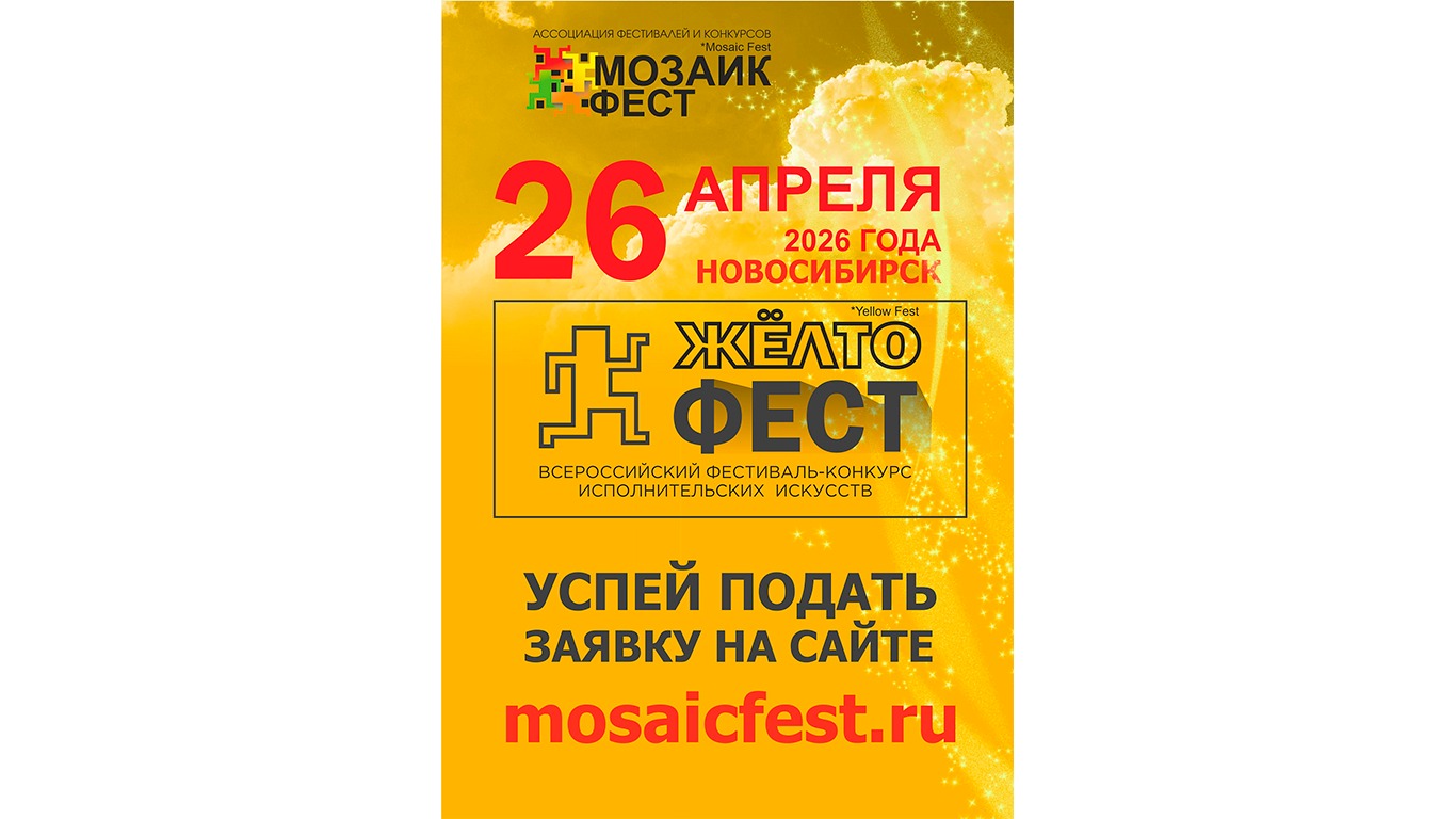 26 апреля 2026 года в Новосибирске на площадке ГАУК НСО «Сибирь–Концерт» состоится IX Всероссийский фестиваль-конкурс исполнительских искусств «ЖЁЛТОфест» (YELLOW FEST). Мероприятие соберёт тысячи участников из разных регионов России, которые продемонстрируют свои таланты в различных жанрах.