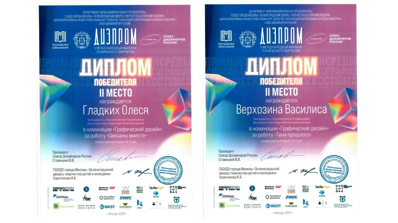 Две учащиеся студии «Дизайн» Школы креативных индустрий получили признание на одном из престижных всероссийских конкурсов дизайна — V Международном марафоне технического творчества «Дизпром». Оба победителя заняли второе место в номинации «Графический дизайн» в возрастной категории 14–17 лет.