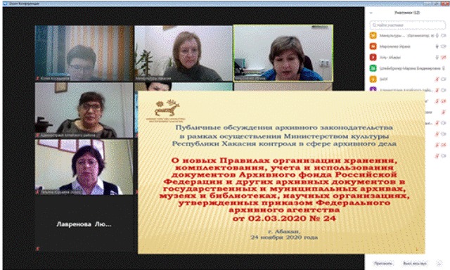 24 ноября 2020 года в формате видеосвязи Министерством культуры Республики Хакасия организовано обсуждение Правил организации хранения, комплектования, учета и использования документов Архивного фонда Российской Федерации и других архивных документов в государственных и муниципальных архивах, музеях и библиотеках, научных организациях, утвержденных приказом Федерального архивного агентства от 02.03.2020 № 24.