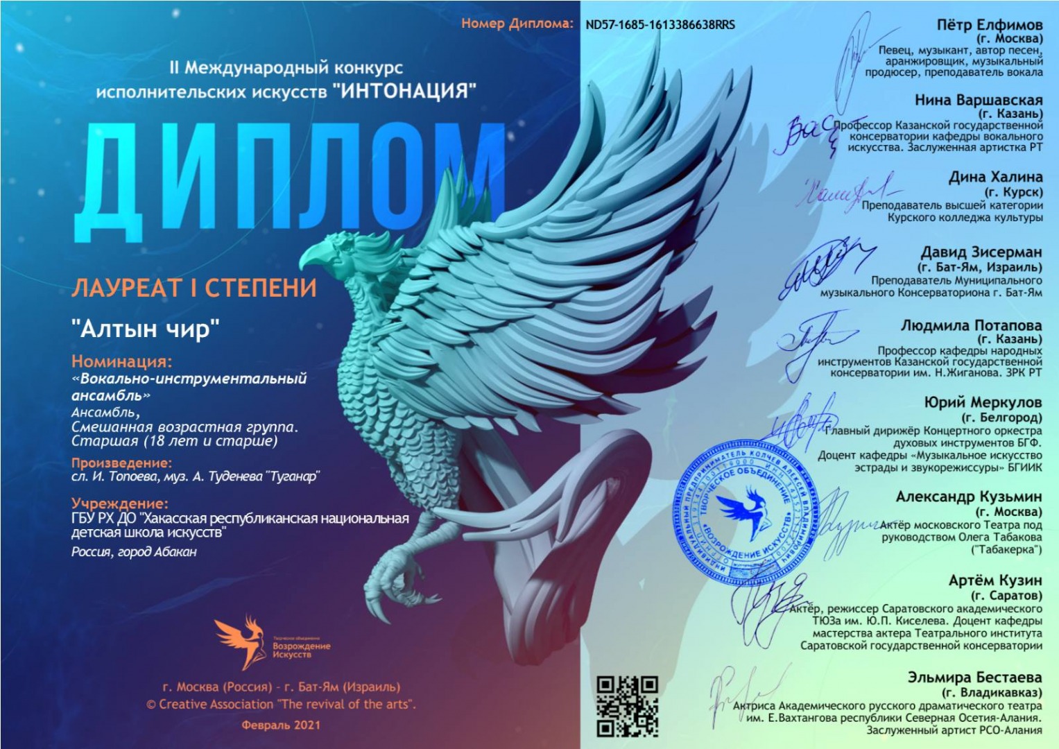 По итогам конкурса «Алтын чир» в номинации «Вокально-инструментальный, инструментальный ансамбль» стал лучшим и завоевал звание Лауреата I степени: