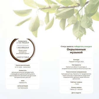 Это результат упорной командной работы коллектива Республиканского методического центра, Управления культуры Алтайского района и Белоярской ДМШ. Проект «Окрылённые музыкой» позволит создать на базе «музыкалки» оркестр русских народных инструментов «Коляда» за счет грантовых средств, а это свыше 3 млн 159 тыс. рублей! Кроме того, около 1,5 млн рублей будет выделено из бюджета района.